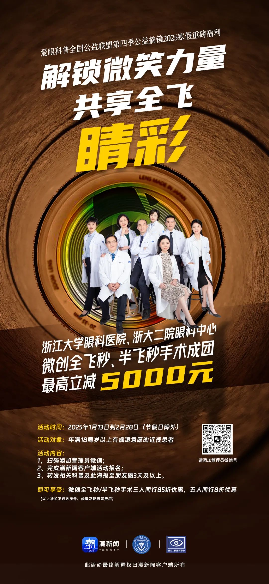 摘鏡煥新,你是否也想送自己一份新年禮?今天起,凡在潮新聞客戶端報名,約上三五好友同行,到浙江大學眼科醫(yī)院(浙大二院眼科中心)做近視激光手術,即可享受微創(chuàng)全飛秒/半飛秒近視激光手術8~8.5折不等優(yōu)惠。掃描海報中的二維碼聯(lián)系活動管理員,即可參與活動。近視激光術后病人還將獲贈浙江大學眼科醫(yī)院送出的精美術后防護鏡一副。