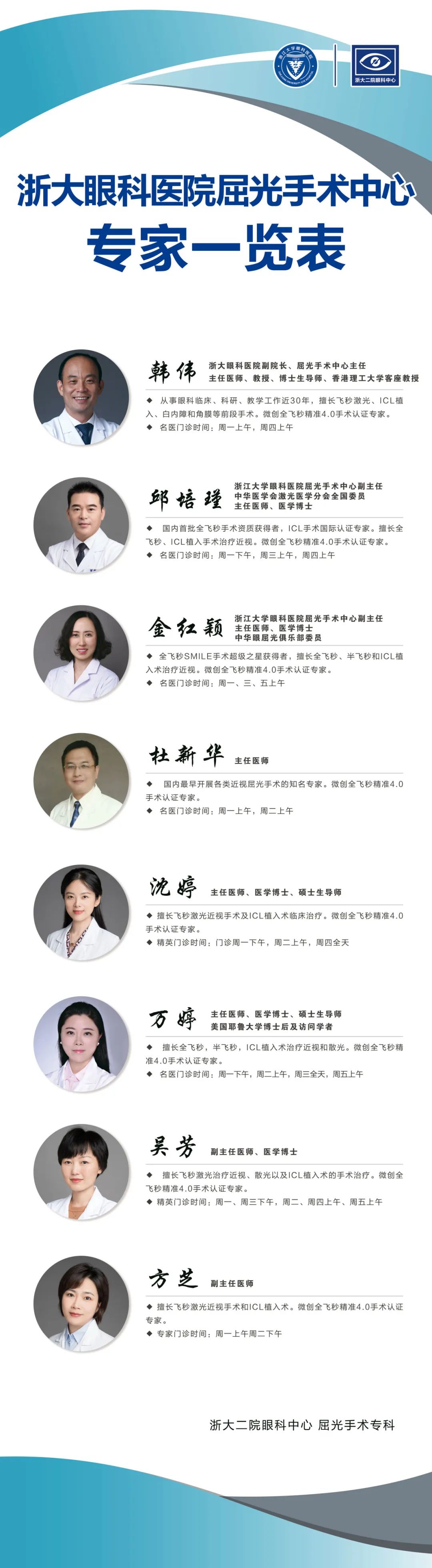 浙江大學眼科醫(yī)院屈光手術團隊之所以名聲在外,背后是經(jīng)驗和實力的支撐:年手術量超過兩萬例,韓偉、邱培瑾、金紅穎、杜新華、沈婷、萬婷、吳芳、方芝8位主刀專家全部擁有博士學位,手術技藝精湛,擅長微創(chuàng)全飛秒、半飛秒、有晶體眼人工晶體植入等近視屈光手術,陣容在全國都處于領先地位。