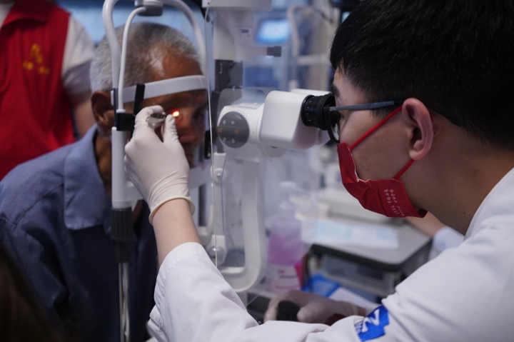 圖注:來凱然副主任醫(yī)師為老人查眼底情況