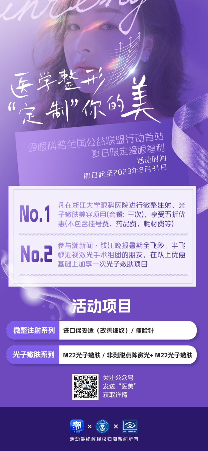 即日起,愛眼科普全國公益聯(lián)盟行動首站愛眼福利:凡在醫(yī)院選擇微整注射系列、光子嫩膚系列的朋友,都可享受五折優(yōu)惠(不包含掛號費、藥品費、耗材費等)。此外,參與潮新聞·錢江晚報暑期全飛秒、半飛秒近視激光手術(shù)組團的朋友,在此優(yōu)惠基礎(chǔ)上還加享一次光子嫩膚,掃碼即可預(yù)約。