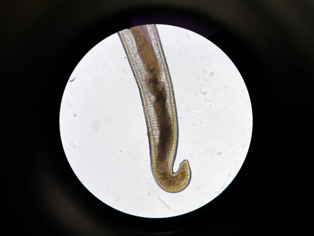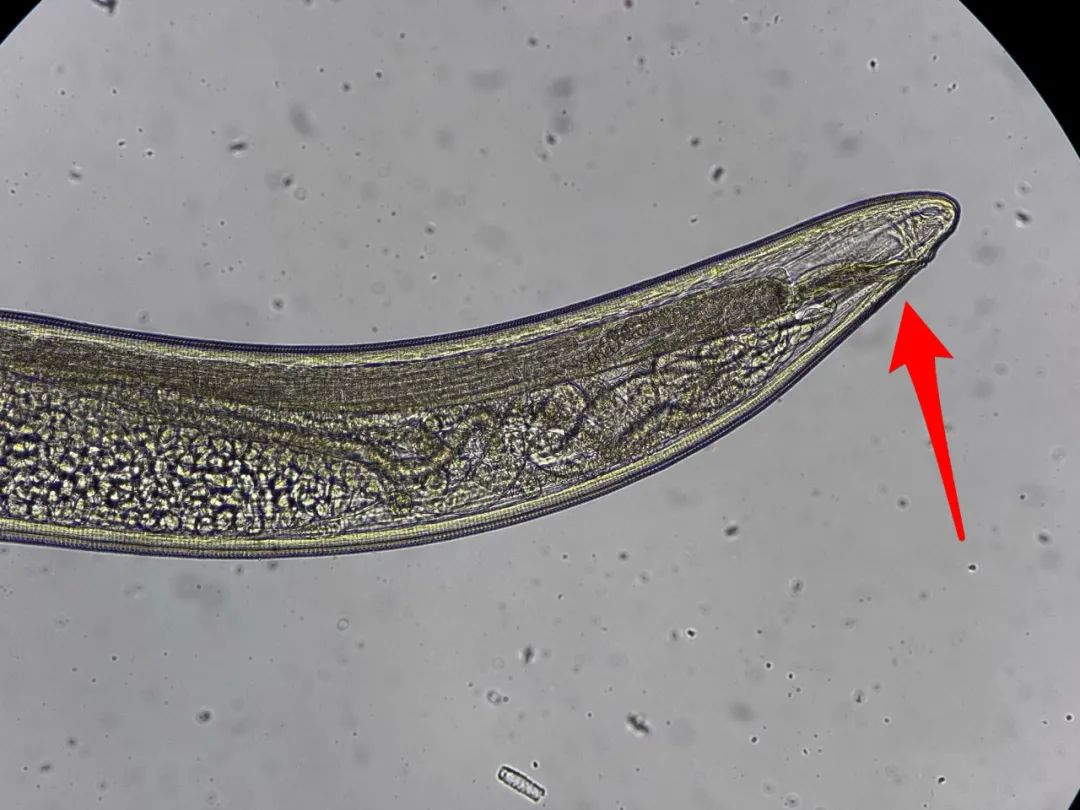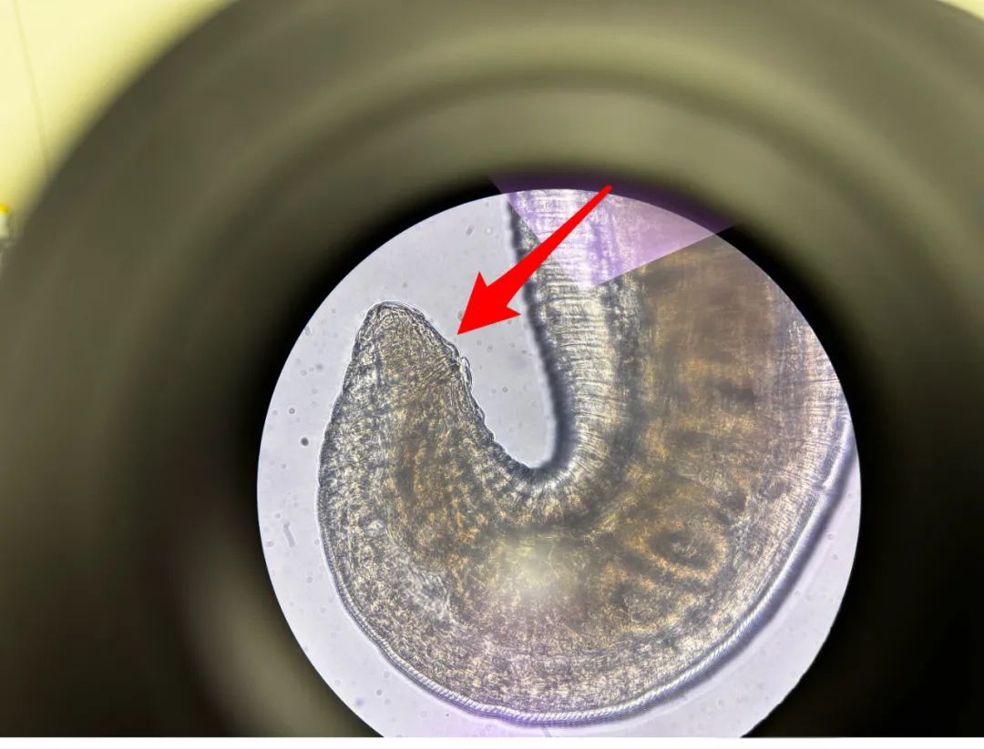 門診接診的角膜與眼表??浦燹阮8敝魅吾t(yī)師將“小白蟲”送到了檢驗科,檢驗科醫(yī)師將蟲體置于顯微鏡下觀察發(fā)現(xiàn),蟲體如細(xì)線有彎曲狀,乳白色,半透明,長度約10mm左右。蟲體頭端及尾端光滑,頭端鈍圓,有口囊,尾端較尖,體表有環(huán)形橫紋,側(cè)觀呈鋸齒狀。蟲體口囊發(fā)達(dá),呈角質(zhì)性,口孔在光鏡下呈圓形或橢圓形。
