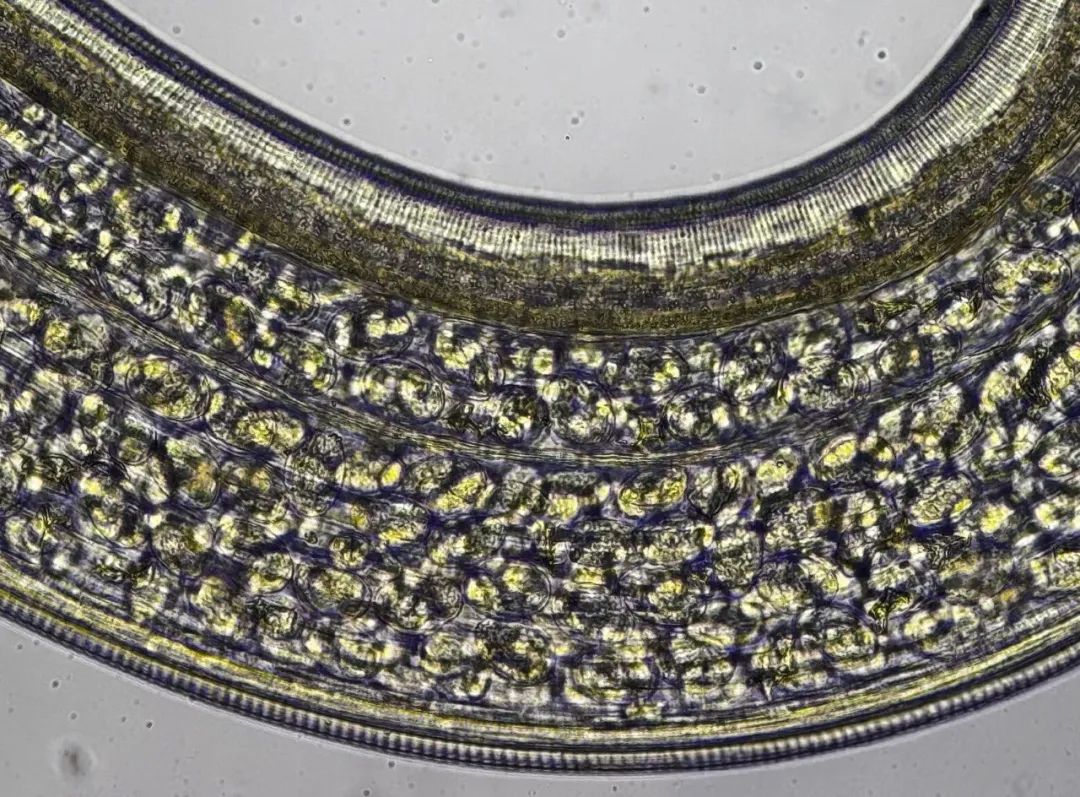 經(jīng)仔細(xì)辨別,第一例病患送檢蟲體為結(jié)膜吸吮線蟲的雌性成蟲,雌蟲子宮內(nèi)充滿蟲卵,近陰門處的蟲卵逐漸變?yōu)閮?nèi)含盤曲的幼蟲,尾部筆直。