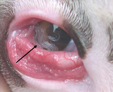 結(jié)膜吸吮線蟲主要在亞洲和歐洲流行,俗稱“東方眼蟲”。蟲體可寄生于犬、 貓等動物眼結(jié)膜囊、淚腺和淚管內(nèi),也可寄生于人眼,引起結(jié)膜吸吮線蟲病。結(jié)膜吸吮線蟲的繁殖方式為卵胎生,其整個生活史需要在中間宿主及終宿主中分別發(fā)育才能完成,該蟲的傳播主要通過中間宿主岡田繞眼果蠅進(jìn)行,而人類和犬、貓等哺乳動物是它的終宿主。人可因飛蠅入眼或與犬貓等動物密切接觸而感染。