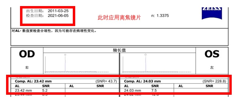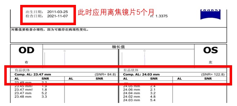 于是,我們?cè)?span style="color: rgb(216, 40, 33);">2021.6.5應(yīng)用了某款離焦鏡片,等到5個(gè)月來(lái)復(fù)查的時(shí)候,2021.11.7查了一下度數(shù)沒(méi)有增長(zhǎng),眼軸也幾乎沒(méi)有變化,在一定程度上表現(xiàn)出來(lái)是有一定的控制效果的。