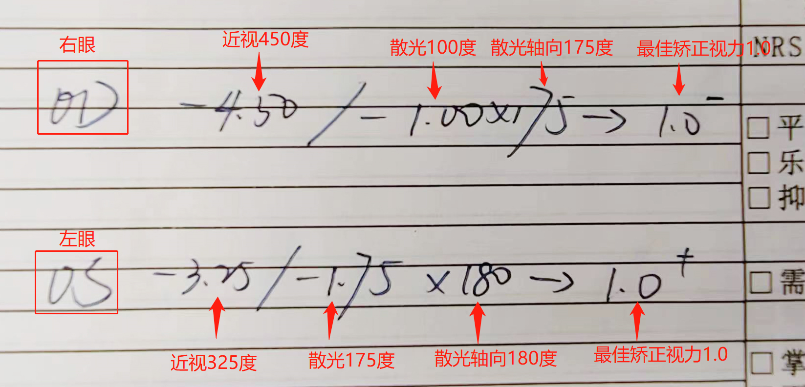 搞清楚電腦驗(yàn)光單上各種符號(hào)的含義,也就不難看懂其他驗(yàn)光單了,比如醫(yī)生的手寫驗(yàn)光單,只要字跡不是很潦草,知道OD=右眼,OS=左眼,并且會(huì)看度數(shù)信息,那么也基本可以看懂。