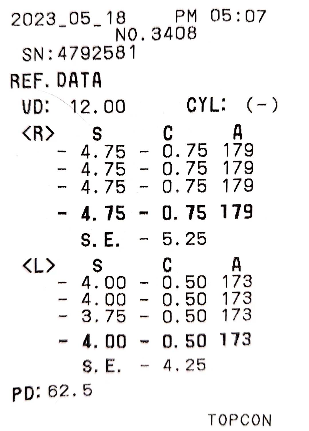 首先看這張電腦驗(yàn)光儀生成的驗(yàn)光單。電腦驗(yàn)光作為一種客觀驗(yàn)光的方法,被廣泛使用。一般在檢查完成后,機(jī)器就會(huì)自動(dòng)生成一張驗(yàn)光數(shù)據(jù)單。