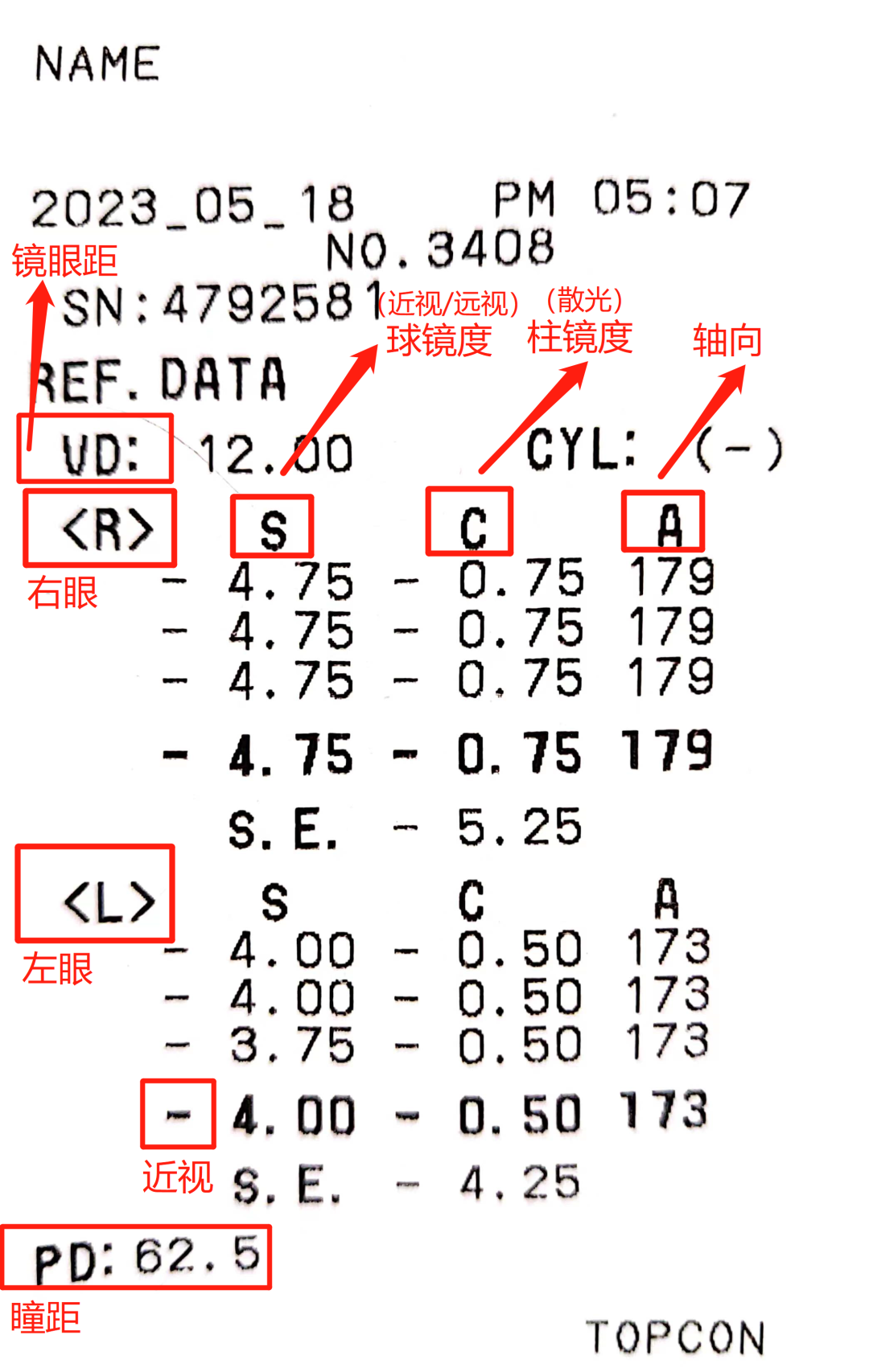 現(xiàn)在我們就能看懂這張電腦驗(yàn)光單了。