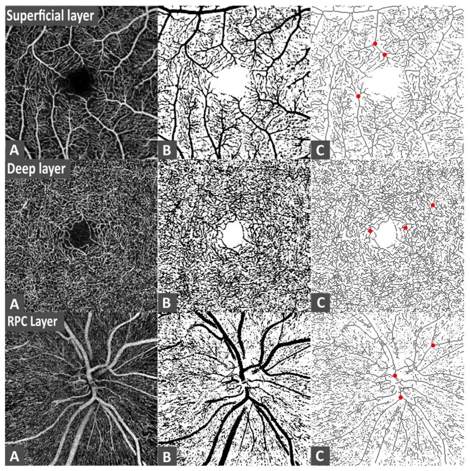 Fig. 2 血管形態(tài)的定量處理。A. 健康人OCTA 3×3掃描圖像。B. 二值化的血管圖,用于血管密度計(jì)算。C. 骨架化的血管圖,用于血管長度密度和分支點(diǎn)密度計(jì)算。紅點(diǎn)表示分支點(diǎn)。