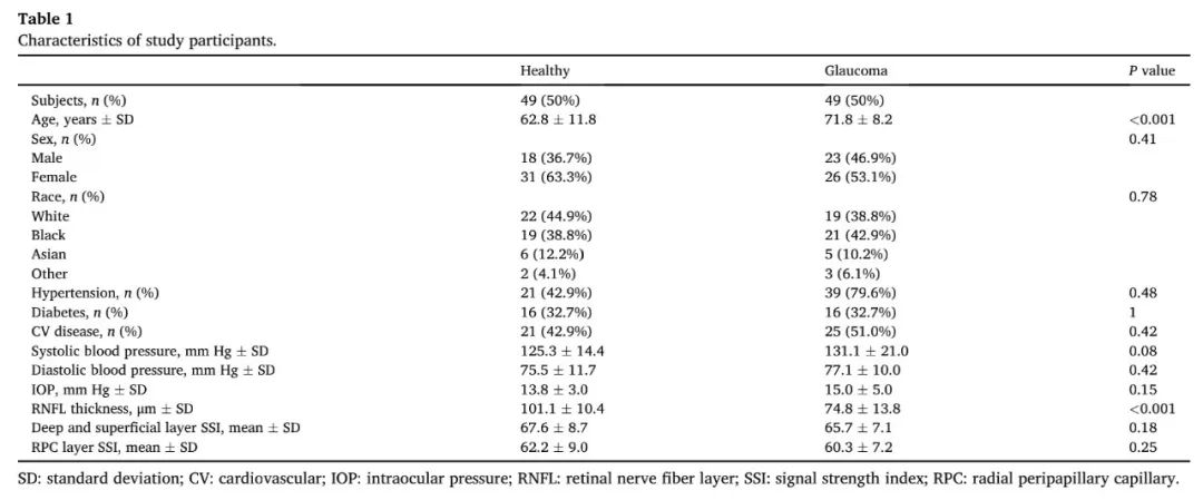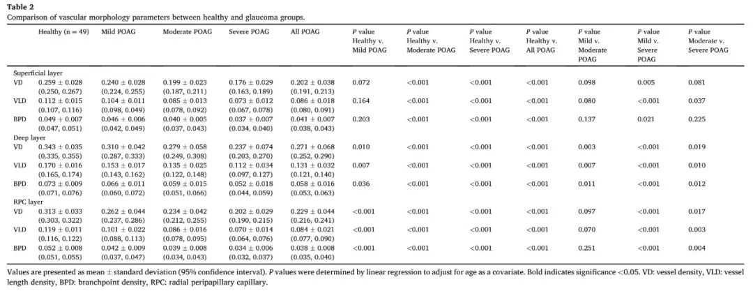 Table2. 健康組和青光眼組血管形態(tài)比較