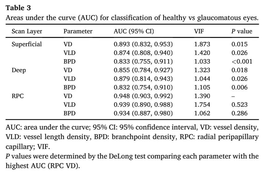 既往研究通過OCTA對(duì)視網(wǎng)膜血管密度(vessel density,VD)進(jìn)行量化提示,與正常人眼相比,POAG患者的黃斑區(qū)及視乳頭區(qū)VD顯著減少,且與青光眼嚴(yán)重程度相關(guān)。通過手術(shù)或藥物治療眼壓下降的青光眼患者中觀察到VD增加,表明OCTA在青光的診斷和隨訪中有重要的應(yīng)用價(jià)值。本研究通過觀察了三個(gè)參數(shù)來量化血管形態(tài):VD,血管長度密度(vessel length density, VLD)和分支點(diǎn)密度(branchpoint density, BPD)。VD定義為血管占據(jù)面積與總圖像面積之比。VLD定義為血管總長度與總圖像面積之比。BPD定義為血管分支點(diǎn)總數(shù)與血管總長度之比。其中分支點(diǎn)是指血管分叉成兩個(gè)或更多血管分支的點(diǎn)。 本文回顧性分析了49例健康人和49例POAG患者黃斑區(qū)及視乳頭的OCTA圖像,對(duì)比了兩組間VD、VLD和BPD的差異,并通過Logistic回歸分類明確上述參數(shù)在青光眼中的診斷價(jià)值。研究結(jié)果顯示,矯正年齡因素后,POAG患者中VD、VLD和BPD在OCTA各層中都顯著降低(P < 0.001),且在視乳頭周圍的區(qū)域最為顯著。放射狀盤周毛細(xì)血管層VD的AUC值為0.939(0.891,0.987),顯著優(yōu)于深層及淺層的VD、VLD和BPD(P < 0.001),但與放射狀盤周毛細(xì)血管層的VLD和BPD無統(tǒng)計(jì)學(xué)差異。