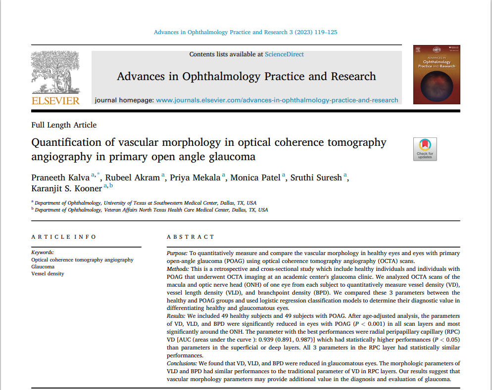 1.Kalva P, Akram R, Mekala P, Patel M, Suresh S , Kooner KS. Quantification of vascular morphology in optical coherence tomography angiography in primary open angle glaucoma. Adv Ophthalmol Pract Res. 2023;3(3); 119-125 doi: 10.1016/j.aopr.2023.05.002