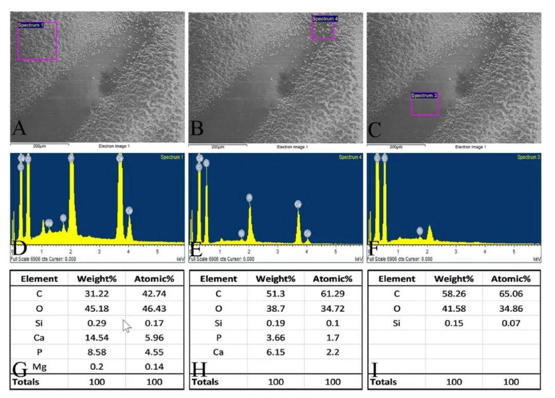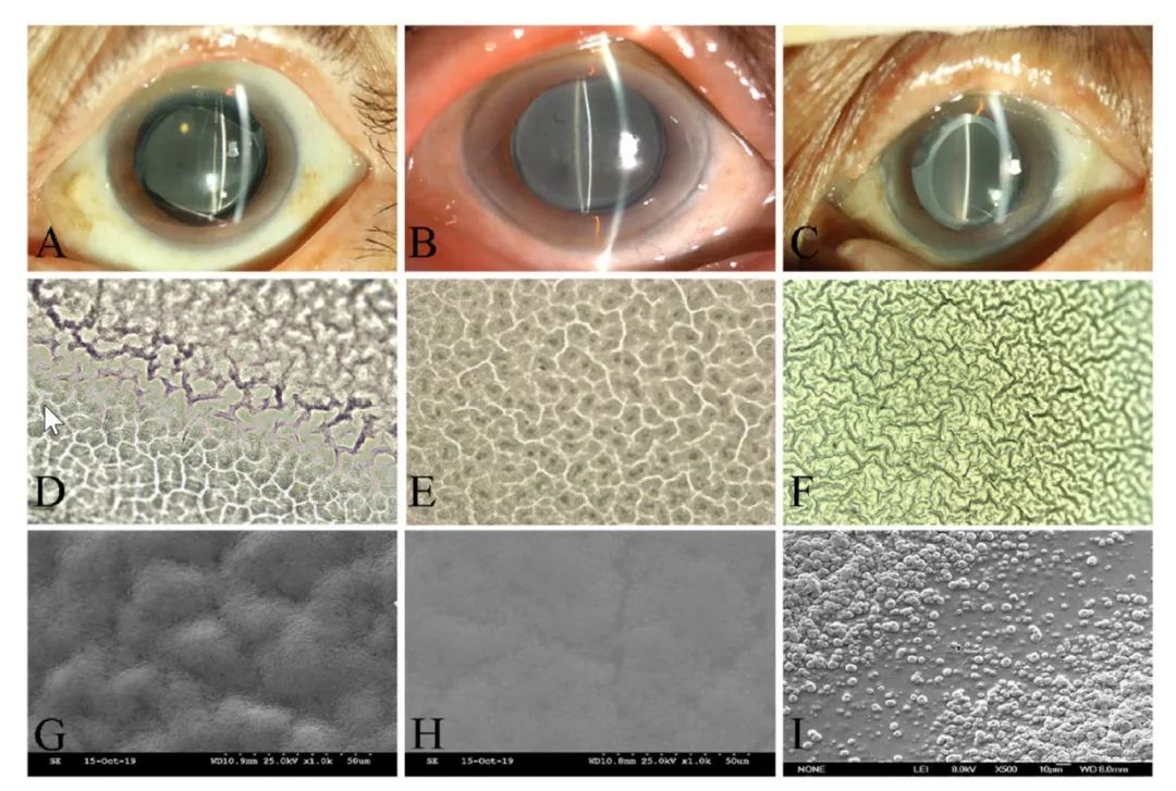 Fig. 1 人工晶狀體鈣化。A-C:三名患者的裂隙燈照片顯示晶狀體混濁不透明。D-F:人工晶狀體共聚焦顯微鏡結(jié)果(×200倍)。人工晶狀體表面呈顆粒狀(D)、溝狀(E)和腦狀(F)外觀。G-I:掃描電鏡顯示人工晶狀體表面有大量沉積物(×1000倍)。