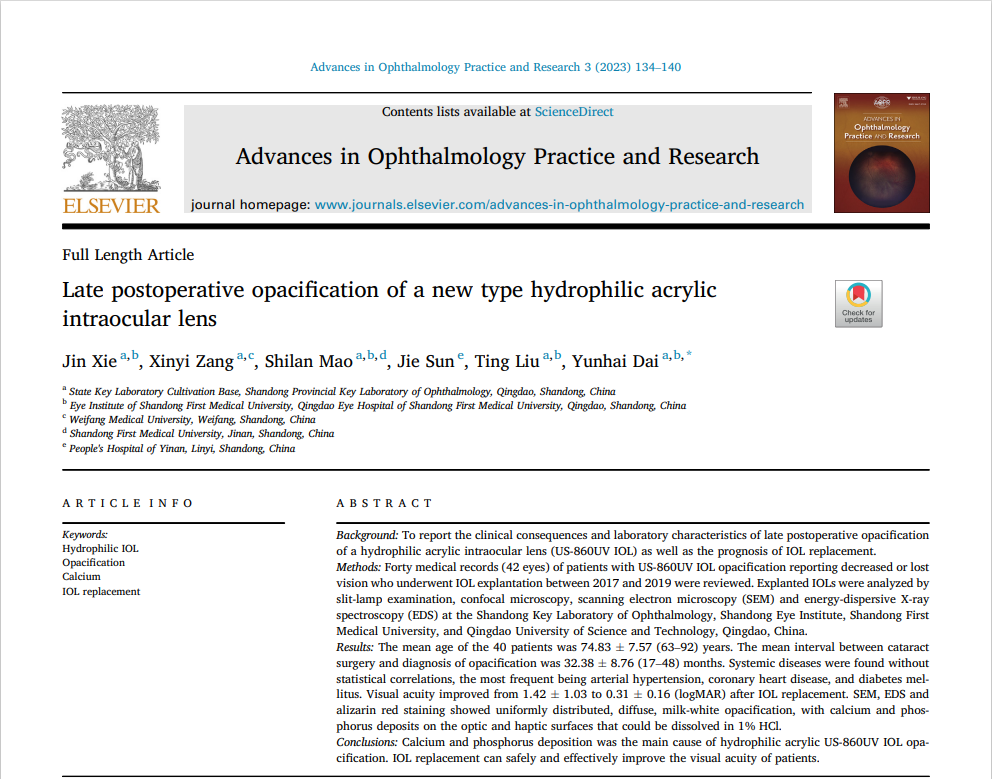 近日,山東第一醫(yī)科大學(xué)附屬青島眼科醫(yī)院代云海教授研究團(tuán)隊(duì)在 “Advances in Ophthalmology Practice and Research” 期刊發(fā)表了題為“Late postoperative opacification of a new type hydrophilic acrylic intraocular lens” 的論文。山東第一醫(yī)科大學(xué)附屬青島眼科醫(yī)院謝晉醫(yī)師為論文第一作者,代云海教授為論文的通訊作者。