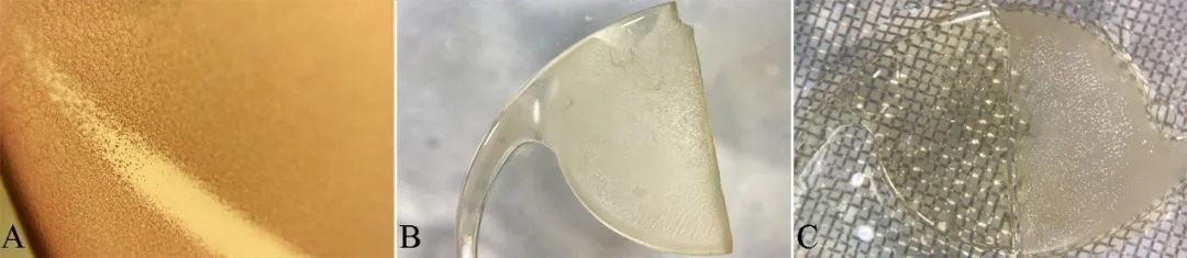 Fig. 3 混濁人工晶體的顯微照片。A:直接茜素紅染色后,人工晶狀體內(nèi)的顆粒鈣染色呈陽性(×40倍)。B-C:浸入1%的稀釋鹽酸溶液中10分鐘后,混濁人工晶體IOL的透明度有所改善。