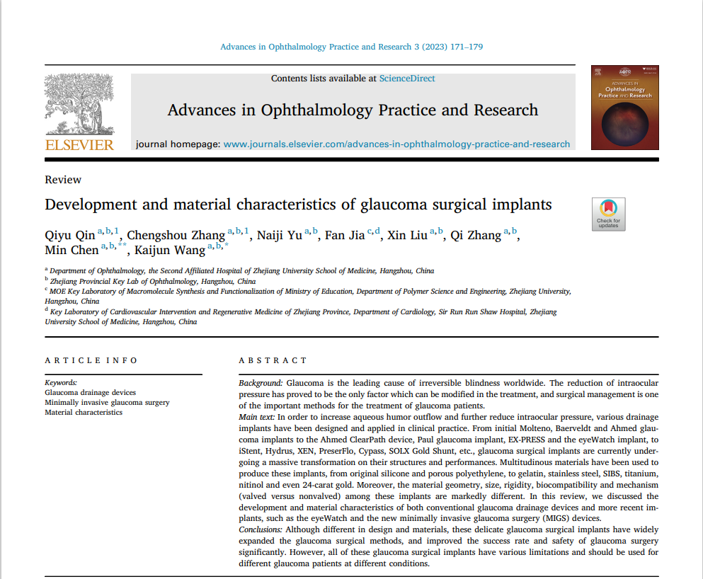 近日,浙江大學(xué)醫(yī)學(xué)院附屬二院眼科中心王凱軍教授研究團隊在 “Advances in Ophthalmology Practice and Research” 期刊發(fā)表了題為“Development and material characteristics of glaucoma surgical implants” 的綜述。浙江大學(xué)醫(yī)學(xué)院附屬二院眼科中心秦齊雨醫(yī)師為論文第一作者,王凱軍主任和陳敏主任為論文的共同通訊作者。