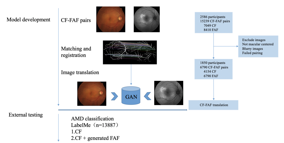 論文導(dǎo)讀 Highlight 年齡相關(guān)性黃斑變性(AMD)是一種導(dǎo)致中心視力逐漸惡化的疾病,其發(fā)病原因與視網(wǎng)膜黃斑區(qū)域的損傷有關(guān)。AMD在全球范圍內(nèi)約占失明病例的9%,在60歲及以上的人群中尤其常見。因此,早期檢測(cè)對(duì)于預(yù)防AMD的進(jìn)展至關(guān)重要。 眼底自發(fā)熒光(FAF)是一種很有價(jià)值的眼科成像技術(shù),可用于評(píng)估視網(wǎng)膜色素上皮(RPE)的代謝變化,且對(duì)于檢測(cè)和評(píng)估AMD有顯著優(yōu)勢(shì)。與眼底彩照 (CF)相比,F(xiàn)AF在臨床上的應(yīng)用仍相對(duì)有限。本研究旨在使用一種生成式深度學(xué)習(xí)(DL)模型,將眼底彩照(CF)轉(zhuǎn)化為合成的FAF圖像,并探索其在年齡相關(guān)性黃斑變性(AMD)疾病篩查方面的潛力。