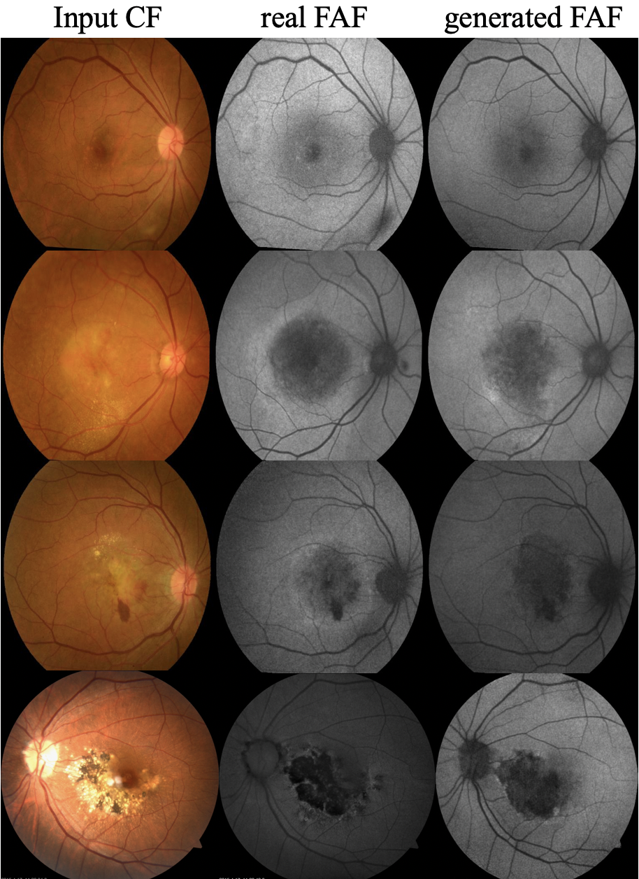 本研究使用匹配的CF 和 FAF 圖像訓(xùn)練生成對(duì)抗網(wǎng)絡(luò) (GAN) 模型,從而達(dá)到利用CF圖像合成FAF 圖像的研究目的。我們使用常見的生成指標(biāo)對(duì)合成的 FAF 圖像進(jìn)行客觀評(píng)估,還使用 LabelMe 數(shù)據(jù)集測(cè)試其在 AMD 分類中的作用。 研究結(jié)果表明,我們的生成式深度學(xué)習(xí)模型首次展示了將 CF 圖像轉(zhuǎn)換為可靠的 FAF 圖像的方法,其為后續(xù)臨床應(yīng)用如大規(guī)模 AMD 篩查和輔助醫(yī)療決策過程帶來可能。