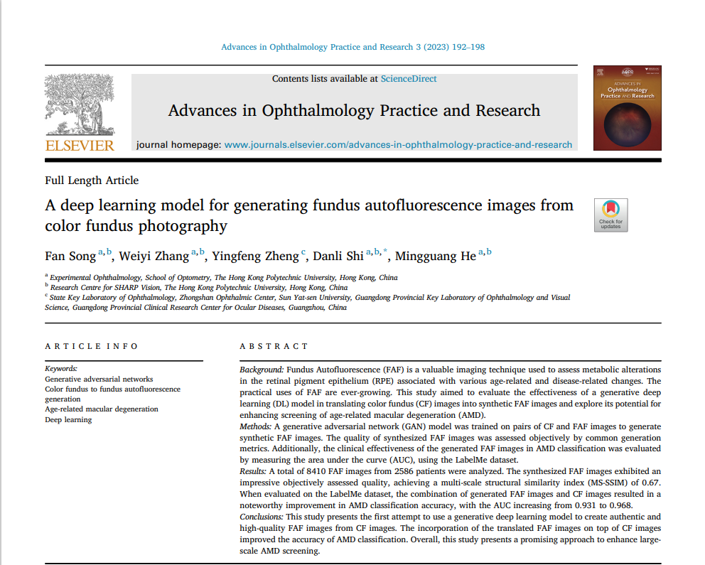 近日,香港理工大學(xué)眼視光學(xué)院何明光教授研究團(tuán)隊(duì)在 “Advances in Ophthalmology Practice and Research” 期刊發(fā)表了題為“A deep learning model for generating fundus autofluorescence images from color fundus photographyg” 的論文。宋帆是該論文的第一作者,施丹莉博士為論文的通訊作者。