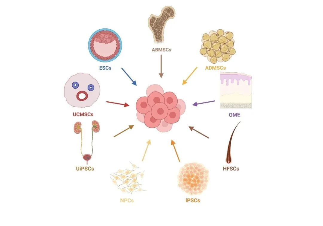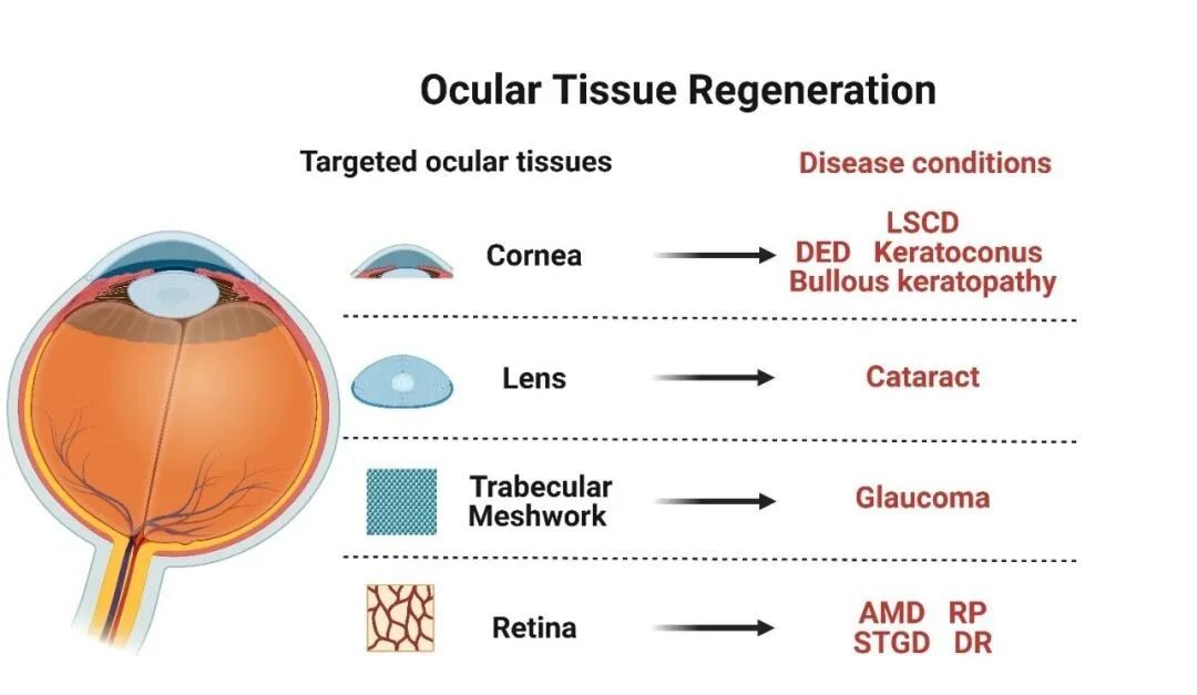 全球范圍內(nèi),各種眼病對人類視覺健康的威脅越來越嚴(yán)重。角膜緣干細(xì)胞缺乏癥,干眼病和視網(wǎng)膜色素變性等疾病會導(dǎo)致眼部不適和視覺功能受損,嚴(yán)重影響生活質(zhì)量。白內(nèi)障,青光眼和老年性黃斑變性等退行性眼病,是全球失明和視力受損的主要原因。針對眼科疾病的傳統(tǒng)療法效果有限,其原理主要是延緩疾病進(jìn)展。而新興的干細(xì)胞療法旨在通過再生受損組織,或是以旁分泌介導(dǎo)的方式恢復(fù)眼部功能。