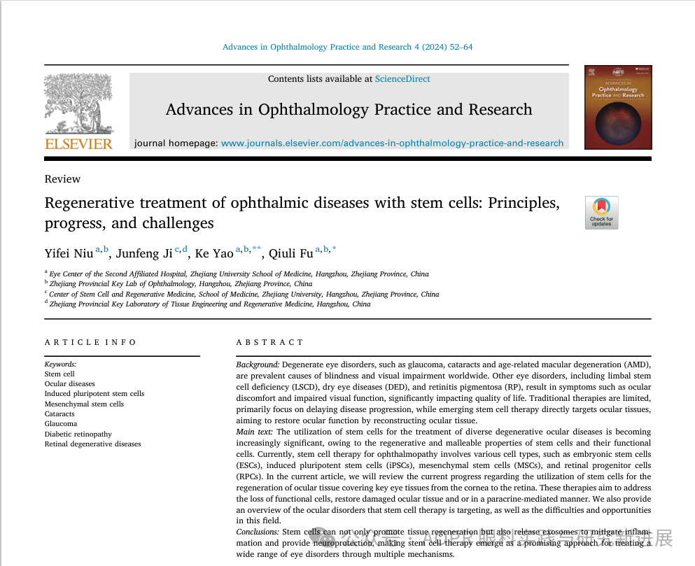 1.Niu Y, Ji J, Yao K, Fu Q, Regenerative treatment of ophthalmic diseases with stem cells: Principles, progress, and challenges, Adv Ophthalmol Pract Res. 2024;4(2):52-64.