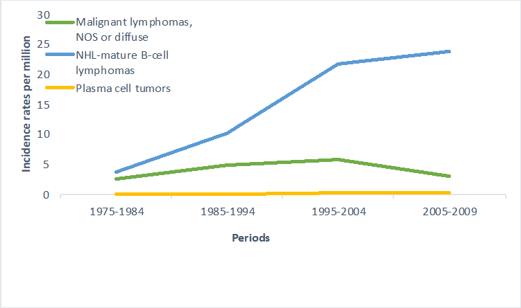 Fig. 2 1973年至2009年美國(guó)不同淋巴瘤亞型調(diào)整年齡后的發(fā)病率變化趨勢(shì)。發(fā)病率以每百萬(wàn)人為單位,并根據(jù)2000年美國(guó)標(biāo)準(zhǔn)人口進(jìn)行年齡調(diào)整