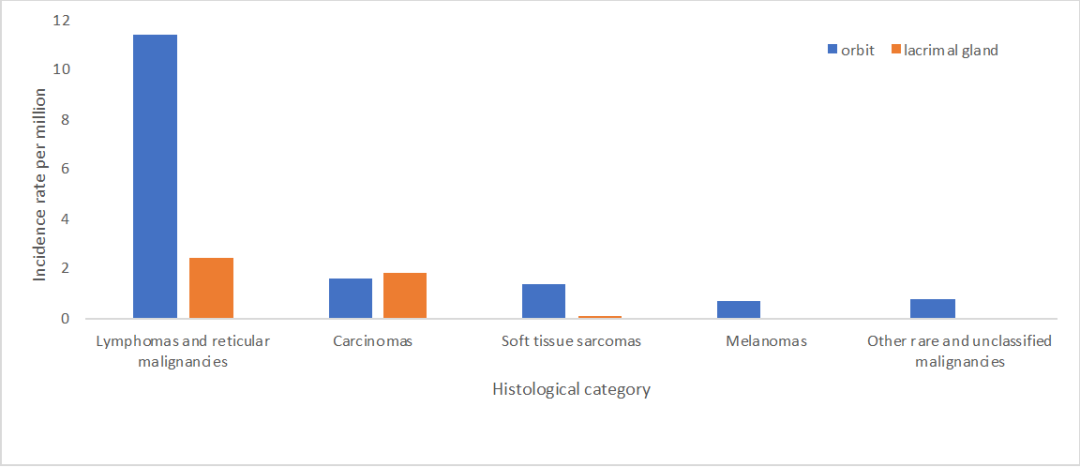 Fig. 1 1973年至2009年美國(guó)按組織學(xué)分類(lèi)調(diào)整年齡后的眼眶和淚腺惡性腫瘤的發(fā)病率。發(fā)病率以每百萬(wàn)人為單位,并根據(jù)2000年美國(guó)標(biāo)準(zhǔn)人口進(jìn)行年齡調(diào)整