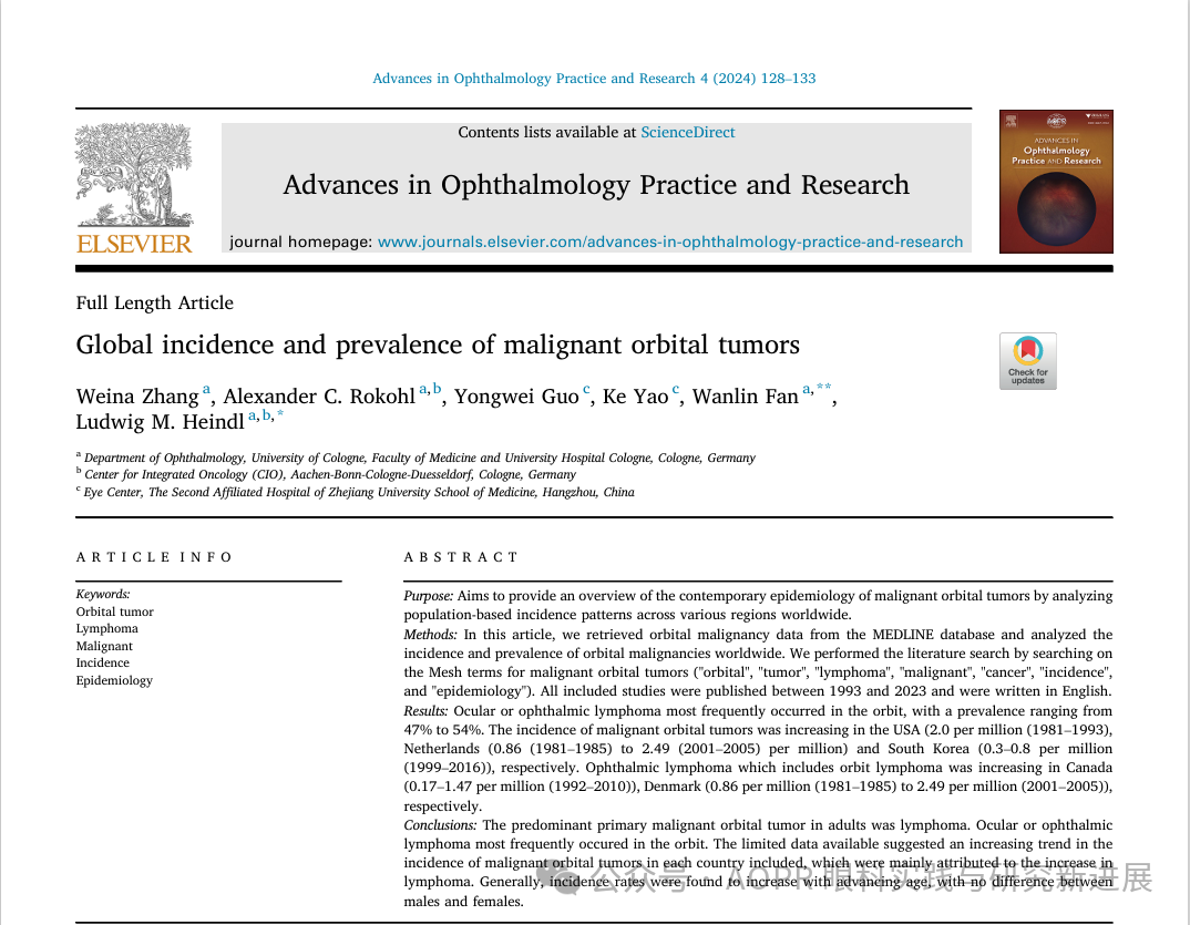 近日,德國(guó)科隆大學(xué)附屬醫(yī)院眼科中心Ludwig M. Heindl教授研究團(tuán)隊(duì)在 “Advances in Ophthalmology Practice and Research” 期刊發(fā)表了題為 “Global incidence and prevalence of malignant orbital tumors” 的論文。德國(guó)科隆大學(xué)附屬醫(yī)院眼科中心博士研究生張維娜為論文第一作者,Ludwig M. Heindl教授、范宛霖博士為論文的通訊作者。