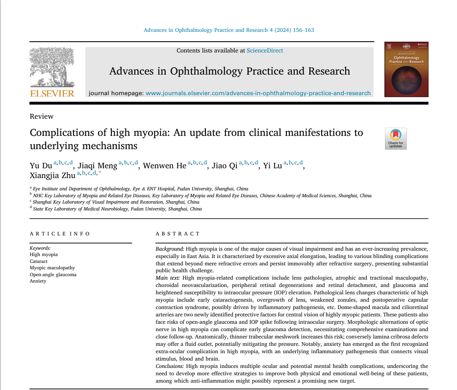 1.Du Y, Meng J, He W, Qi J, Lu Y, Zhu X. Complications of high myopia: An update from clinical manifestations to underlying mechanisms. Adv Ophthalmol Pract Res. 2024; 4(3): 156-163. doi: 10.1016/j.aopr.2024.06.003