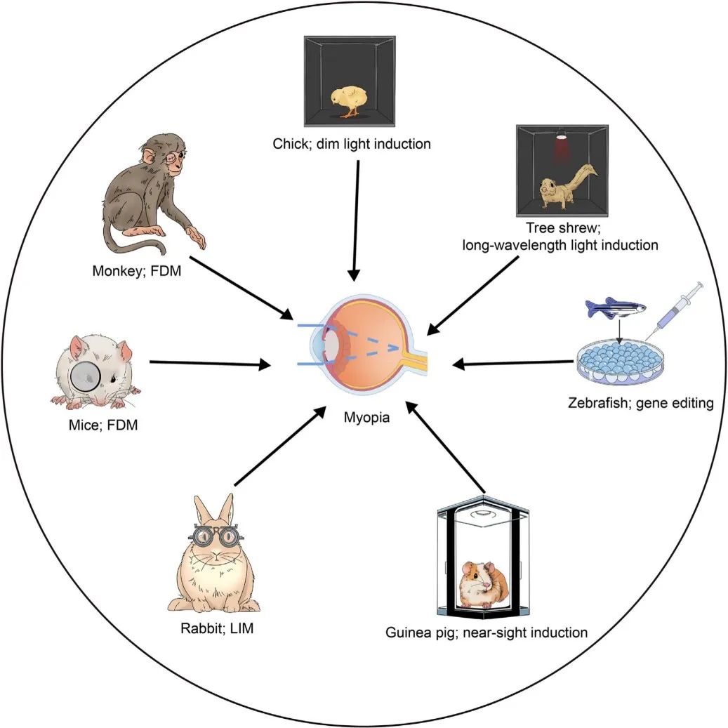動物模型對于理解人類疾病的病因至關(guān)重要。研究人員已經(jīng)開發(fā)了多種實(shí)驗(yàn)動物模型來模擬人類近視,包括雞、恒河猴、狨猴、小鼠、樹鼩、豚鼠和斑馬魚等。這些模型為研究眼軸生長和屈光發(fā)育的調(diào)節(jié)機(jī)制提供了重要依據(jù)。由于物種差異,每個(gè)動物模型都有其優(yōu)缺點(diǎn),研究結(jié)果可能與人類近視存在一定差異。未來的研究需要進(jìn)一步整合多種動物模型和研究方法,以更好地理解和治療人類近視。本綜述對近視動物模型的發(fā)展、特點(diǎn)、誘導(dǎo)方法以及調(diào)控近視發(fā)生發(fā)展的重要已知因素進(jìn)行了全面總結(jié)。