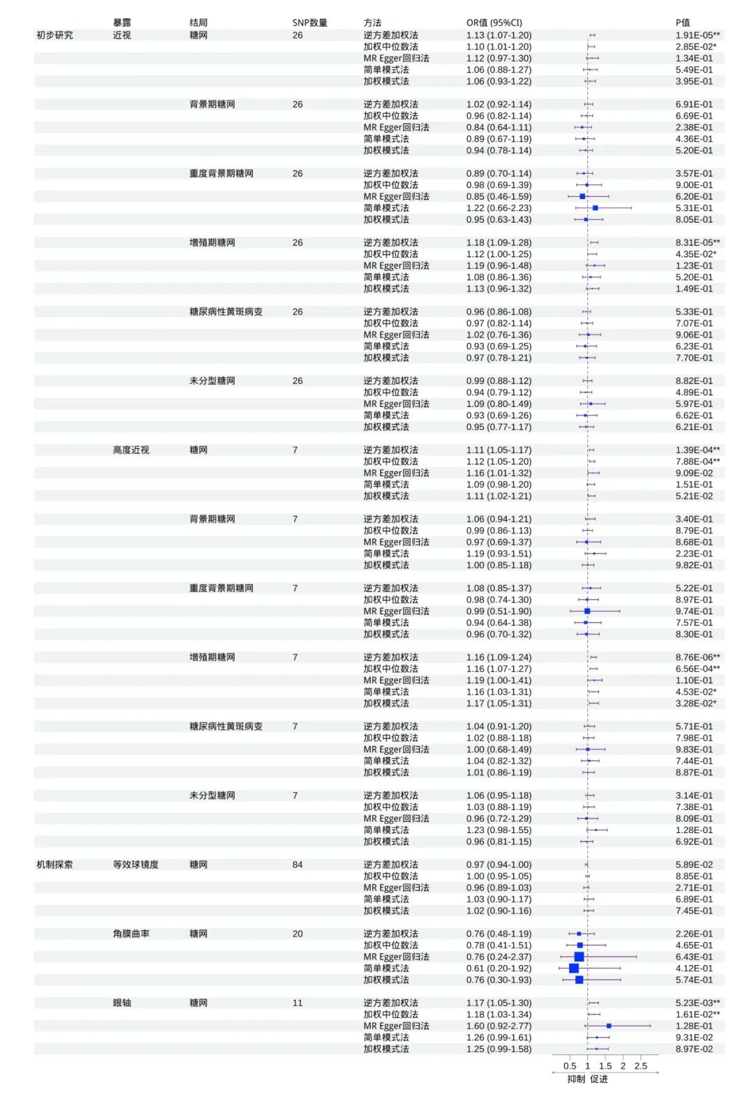 圖2. 近視與糖尿病視網(wǎng)膜病變因果關(guān)系的孟德?tīng)栯S機(jī)化研究關(guān)聯(lián)性分析結(jié)果