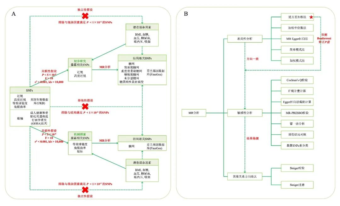 圖1. 近視與糖尿病視網(wǎng)膜病變因果關(guān)系的孟德?tīng)栯S機(jī)化研究流程圖