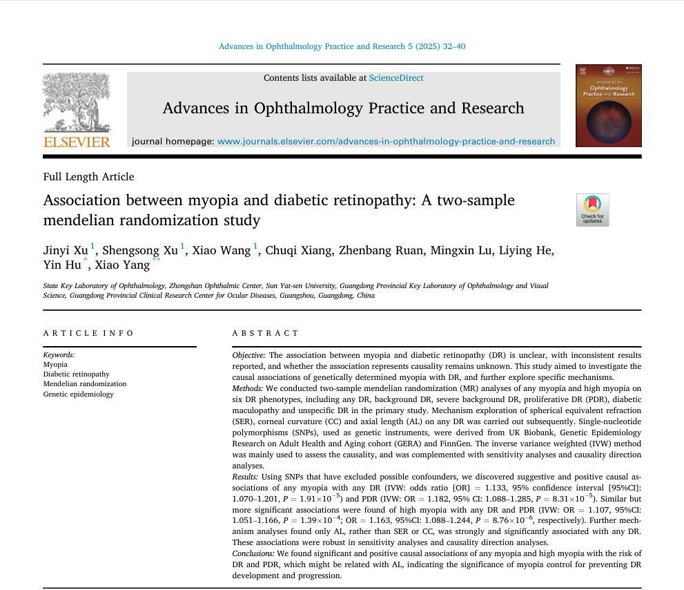 近日,中山大學(xué)中山眼科中心楊曉教授研究團(tuán)隊(duì)在 “Advances in Ophthalmology Practice and Research” 期刊發(fā)表了題為“Association between myopia and diabetic retinopathy: A two-sample mendelian randomization study” 的研究論文。中山大學(xué)中山眼科中心徐贐祎博士、許晟嵩博士和汪瀟碩士為論文第一作者,楊曉教授為論文通訊作者。