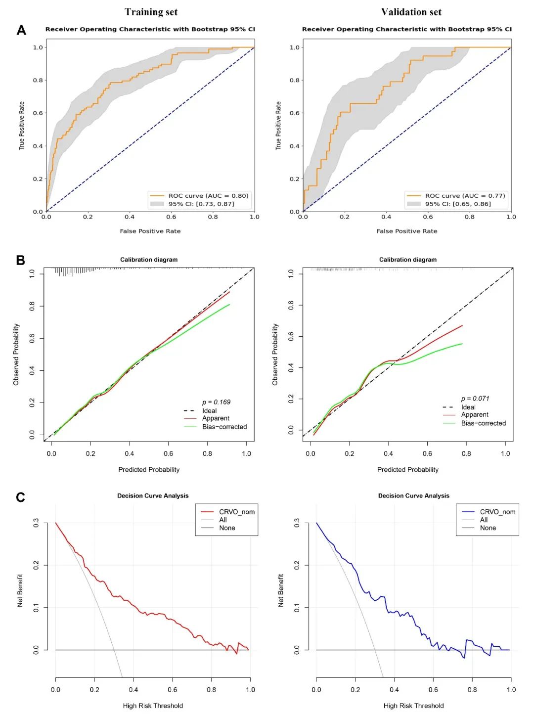 Fig.1. 視網(wǎng)膜中央靜脈阻塞(CRVO)-nom 預(yù)測(cè)模型的性能評(píng)估。A. ROC曲線及AUC值 B. 校準(zhǔn)曲線及Hosmer-Lemeshow檢驗(yàn)的P值 C. DCA曲線。