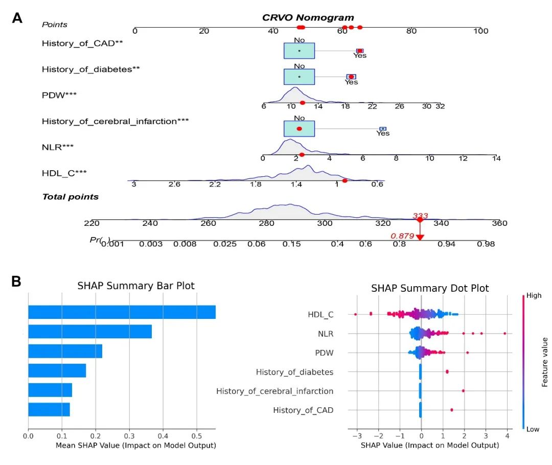 Fig.2. CRVO-nom 可視化及模型SHAP解釋。A. 動(dòng)態(tài)列線圖示例: 一個(gè)患有冠狀動(dòng)脈疾病(CAD)、糖尿病、PDW =11.70 fL、NLR= 2.34、HDL-C= 0.92 mmol/L、無腦梗塞病史的人,其 CRVO 預(yù)估風(fēng)險(xiǎn)為 87.9%;B. 基于SHAP的全局解釋:條形圖(左)按平均 SHAP 值排列特征;點(diǎn)圖(右)顯示 CRVO 風(fēng)險(xiǎn)隨特征變化而上升―紅色(值較高)和藍(lán)色(值較低)。垂直堆疊反映了數(shù)值密度。
