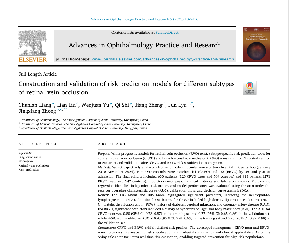 1. Liang C, Liu L, Yu W, Shi Q, Zheng J, Lyu J, Zhong J. Construction and validation of risk prediction models for different subtypes of retinal vein occlusion. Adv Ophthalmol Pract Res. 2025;5(2):107-116. https://doi.org/10.1016/j.aopr.2025.03.003