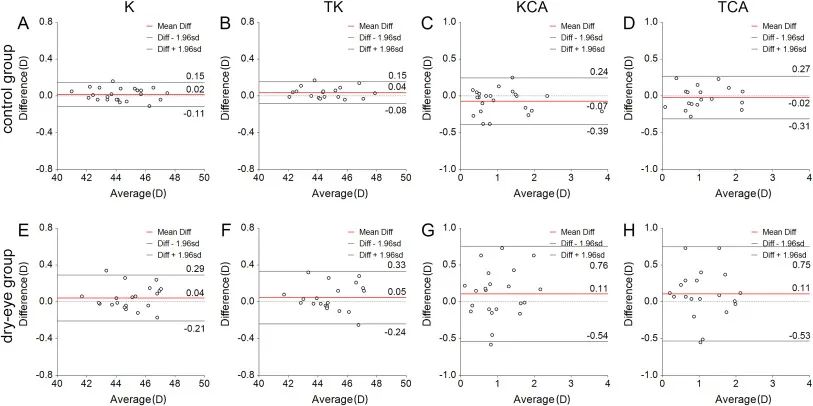 Fig.1. 角膜度數(shù)和角膜散光兩次測量結(jié)果的一致性分析。通過 Bland-Altman 分析結(jié)果來評估對照組的 K (A)、TK (B)、KCA (C) 和 TCA (D) 以及干眼癥組的 K (E)、TK (F)、KCA (G) 和 TCA (H) 兩次測量結(jié)果之間的一致性。K = 標準角膜度數(shù);TK = 總角膜度數(shù);KCA = 角膜散光度數(shù);TCA = 總角膜散光度數(shù)。