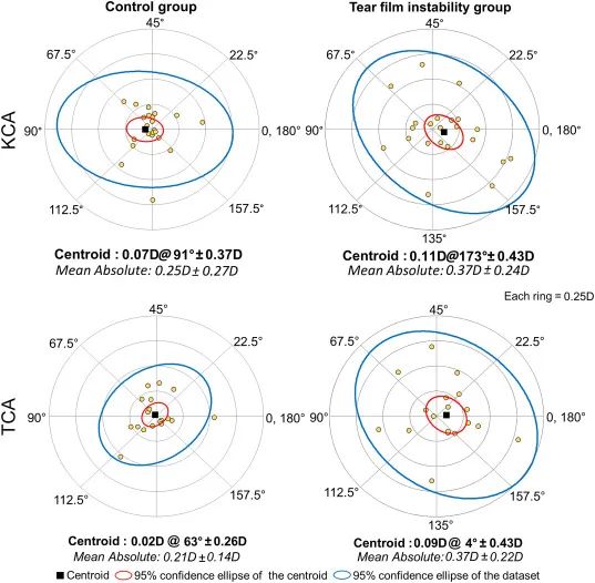 Fig.2. 對照組和干眼癥組角膜散光矢量變化的雙角圖。KCA = 角膜散光度數(shù);TCA = 角膜總散光度數(shù)。