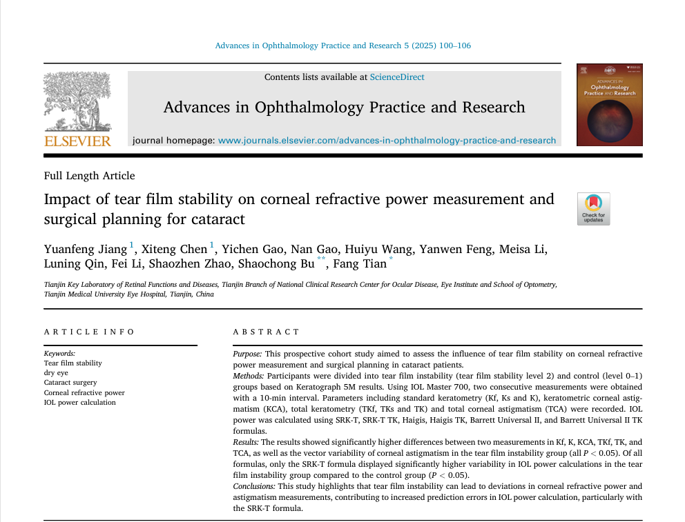 近日,天津醫(yī)科大學(xué)眼科醫(yī)院白內(nèi)障團隊在 “Advances in Ophthalmology Practice and Research” 期刊發(fā)表了題為“Impact of tear film stability on corneal refractive power measurement and surgical planning for cataract” 的臨床研究論文。蔣元豐博士和陳曦騰博士為論文第一作者,田芳主任和步紹翀主任為論文的共同通訊作者。