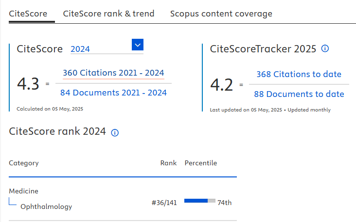 2025年6月4日,根據(jù) Scopus 數(shù)據(jù)庫(kù)正式發(fā)布的2024年度CiteScore, 浙大二院眼科中心創(chuàng)辦的英文期刊 Advances in Ophthalmology Practice and Research(簡(jiǎn)稱AOPR,中文名:眼科實(shí)踐與研究新進(jìn)展)最新CiteScore為 4.3,辦刊剛4年(21年11月發(fā)布第一期)就位居全球眼科和視覺(jué)科學(xué)相關(guān)類(Ophthalmology)141本期刋中第36位!
