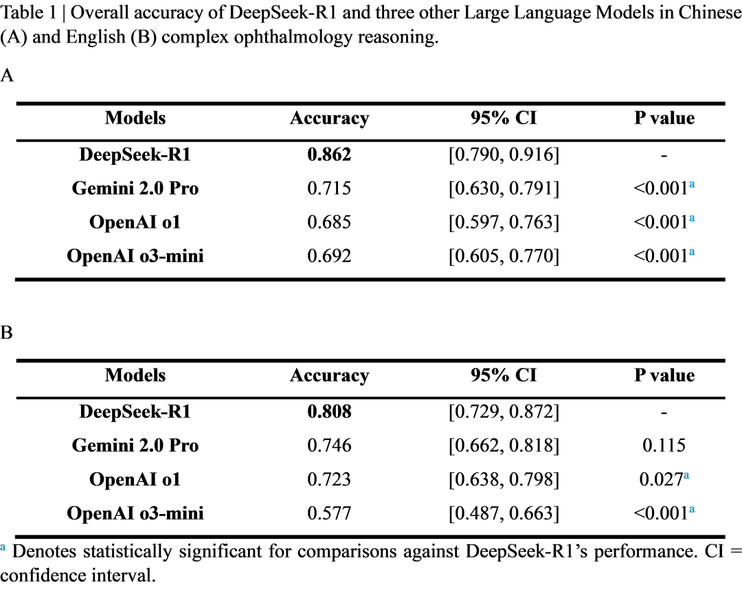 香港理工大學(xué)團(tuán)隊(duì):DeepSeek-R1在雙語(yǔ)復(fù)雜眼科推理任務(wù)中的表現(xiàn)優(yōu)于Gemini 2.0 Pro以及OpenAI的o1和o3-mini模型