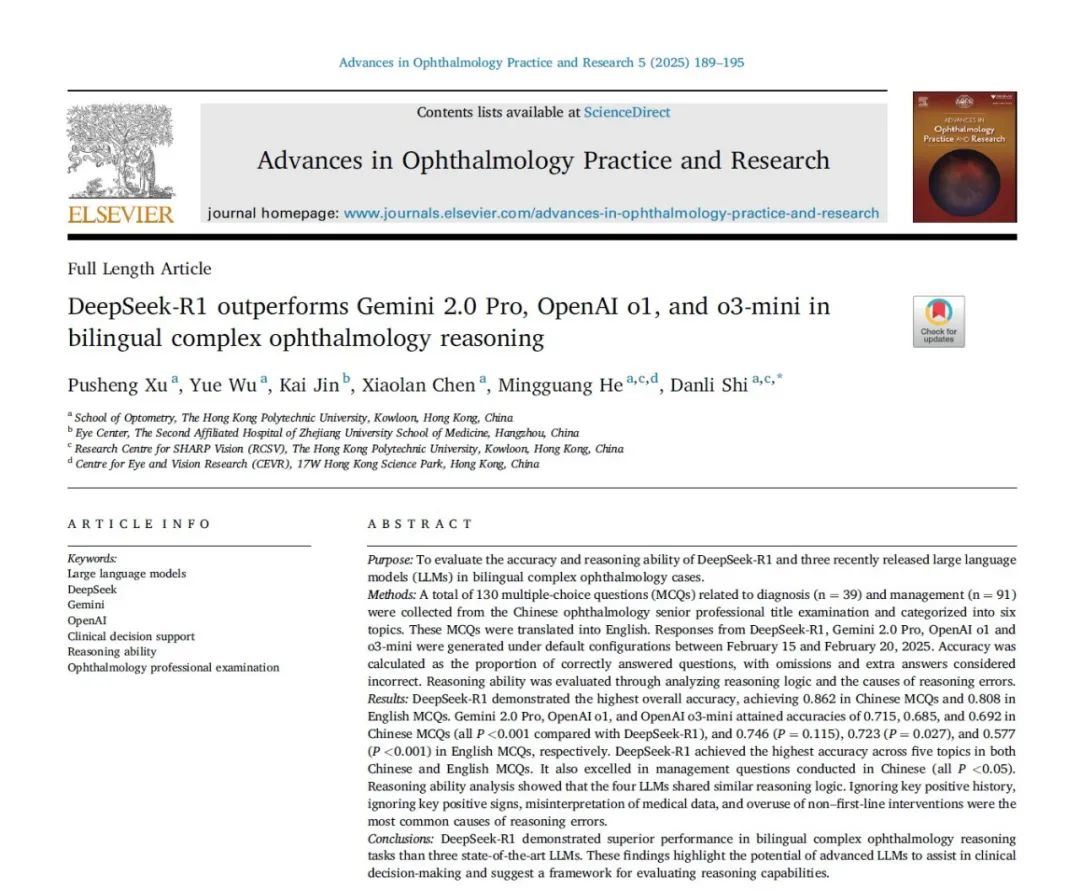 近日,香港理工大學(xué)眼科視光學(xué)院何明光, 施丹莉團(tuán)隊(duì)在 “Advances in Ophthalmology Practice and Research” 期刊發(fā)表了題為“DeepSeek-R1 outperforms Gemini 2.0 Pro, OpenAI o1, and o3-mini in bilingual complex ophthalmology reasoning” 的研究論文。香港理工大學(xué)許普生研究助理為論文第一作者,施丹莉助理教授為論文通訊作者。