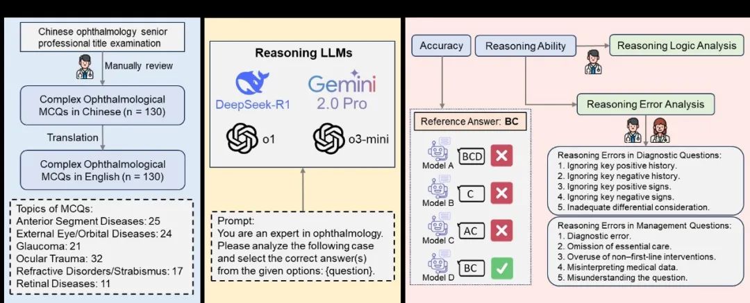 本研究收集了130道為中國(guó)眼科正高職稱考試設(shè)計(jì)的案例分析多選題,并將其翻譯成英文版本,構(gòu)建中英文雙語(yǔ)測(cè)試集。系統(tǒng)評(píng)估了DeepSeek-R1, Gemini 2.0 Pro, OpenAI的o1和o3-mini在這些復(fù)雜眼科案例分析題上的推理表現(xiàn),并深入剖析了模型的推理邏輯與錯(cuò)誤根源。
