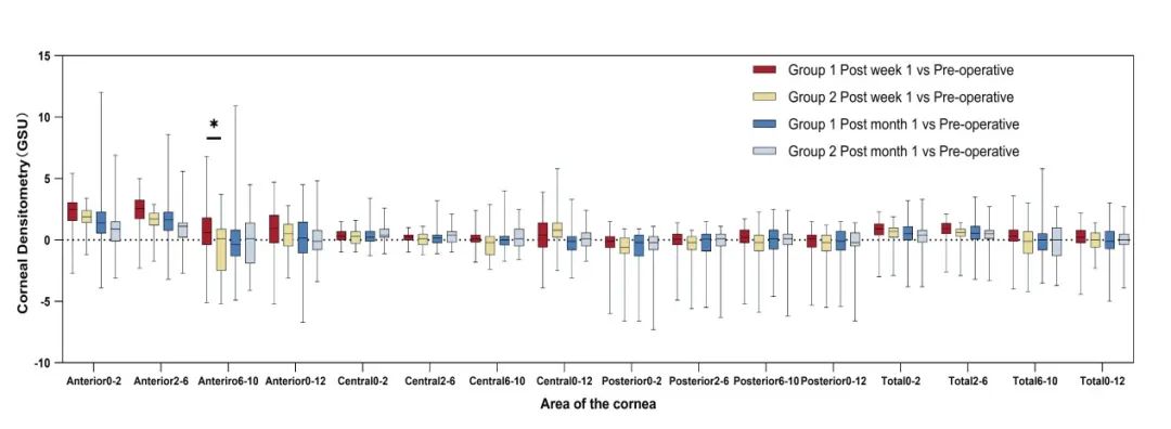 本研究納入了 39 例患者(69 只眼),其中接受 120 μm 帽厚 SMILE 手術(shù)的有 34 只眼,接受 130 μm 帽厚的有 35 只眼。在術(shù)前、術(shù)后 1 周和 1 個(gè)月,對(duì)角膜前、中、后三層的三個(gè)區(qū)域(0-2 mm、2-6 mm 和 6-10 mm)的角膜光密度(CD)進(jìn)行評(píng)估,同時(shí)分析兩組患者手術(shù)前后的裸眼遠(yuǎn)視力(UDVA)、矯正遠(yuǎn)視力(CDVA)、球鏡度數(shù)、柱鏡度數(shù)、等效球鏡(SE)、高階像差等指標(biāo)。