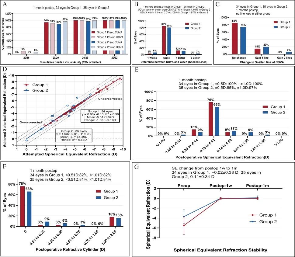 Fig. 1. 不同帽厚 SMILE 術(shù)后的屈光和視覺結(jié)果。