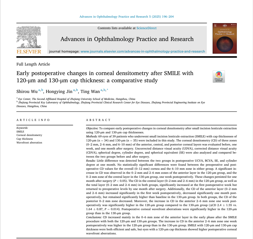 近日,浙大二院眼科中心萬婷主任研究團(tuán)隊(duì)在 “Advances in Ophthalmology Practice and Research” 期刊發(fā)表了題為“Early postoperative changes in corneal densitometry after SMILE with 120-μm and 130-μm cap thickness: a comparative study” 的研究論文。浙江大學(xué)吳詩(shī)柔為論文作者,萬婷主任為論文通訊作者。