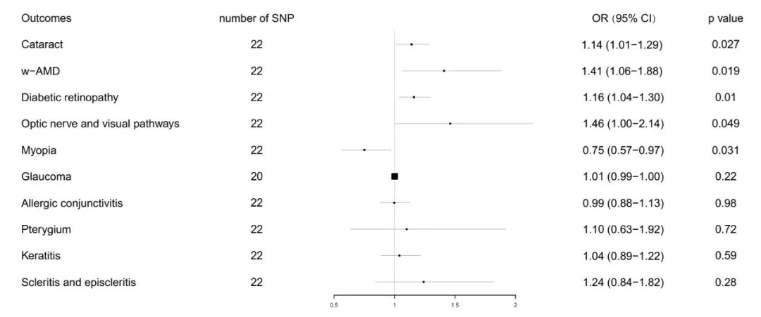 1. 吸煙是四種眼部疾病的危險(xiǎn)因素:白內(nèi)障(OR=1.14, 95%CI=1.01-1.29, P=0.027)、濕性年齡相關(guān)性黃斑變性(w-AMD)(OR=1.41, 95%CI=1.06-1.88, P=0.019)、糖尿病視網(wǎng)膜病變(OR=1.16, 95%CI=1.04-1.30, P=0.01)、視神經(jīng)和視覺(jué)通路疾病(OR=1.46, 95%CI=1.00-2.14, P=0.049);