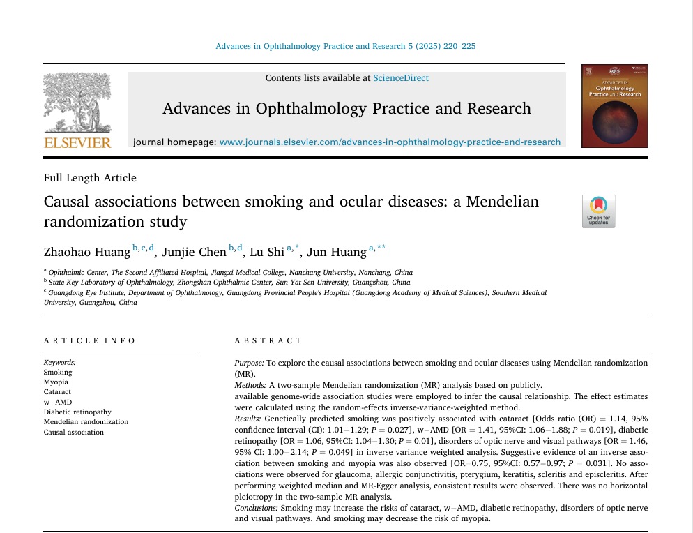 1. Huang Z, Chen J, Shi L, Huang J. Causal associations between smoking and ocular diseases: a Mendelian randomization study. Adv Ophthalmol Pract Res. 2025;5(3):220-225