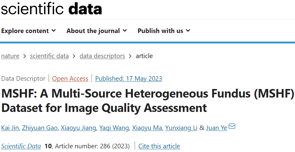 2023年5月17日,浙江大學(xué)葉娟團隊(金凱為本文的第一作者)在Scientific Data(IF=9.8)在線發(fā)表題為“MSHF: A Multi-Source Heterogeneous Fundus (MSHF) Dataset for Image Quality Assessment”的研究性論文,并應(yīng)邀在Nature的Health Community中“Behind the paper”欄目撰文分享該項研究背后的故事。