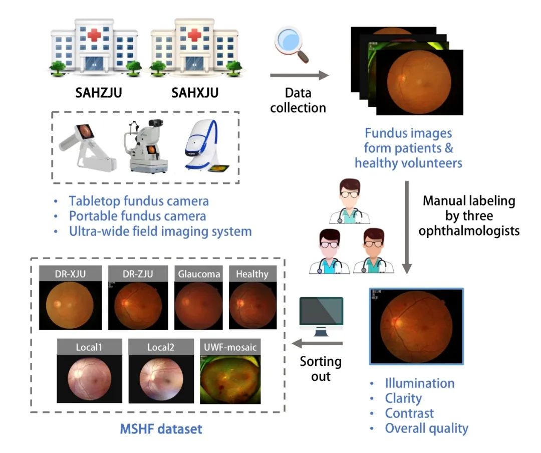 在過去的幾年中,基于深度學(xué)習(xí)的醫(yī)學(xué)圖像質(zhì)量評價模型開始不斷出現(xiàn)。一旦模型訓(xùn)練完成,它可以產(chǎn)生快速和實時地給予臨床反饋,優(yōu)化醫(yī)學(xué)圖像采集流程,使整個AI輔助診斷過程更加高效。為了訓(xùn)練出一個優(yōu)秀的模型,一個良好的數(shù)據(jù)集非常重要。國際上已構(gòu)建多個眼底圖像質(zhì)量評估數(shù)據(jù)集,如DRIMDB、Kaggle DR Image Quality、EyeQ Assessment、DeepDRiD等。研究人員在這些數(shù)據(jù)集上進行了一系列圖像質(zhì)量評估和AI輔助診斷的研究。然而,大多數(shù)現(xiàn)有的圖像質(zhì)量評估數(shù)據(jù)集都是單中心數(shù)據(jù)集,忽視了成像設(shè)備類型、眼部情況和成像環(huán)境的差異。該研究提出了多源異構(gòu)眼底數(shù)據(jù)集(MSHF)構(gòu)建的標準化流程,其中包括普通眼底圖像、便攜式眼底圖像和超廣角眼底圖像,包含糖尿病視網(wǎng)膜病變等多種眼病,并對圖像的質(zhì)量進行了系統(tǒng)性的描述。多源異構(gòu)數(shù)據(jù)集(MSHF)的建立將極大程度地促進數(shù)字化眼病診斷技術(shù)向臨床落地轉(zhuǎn)化。