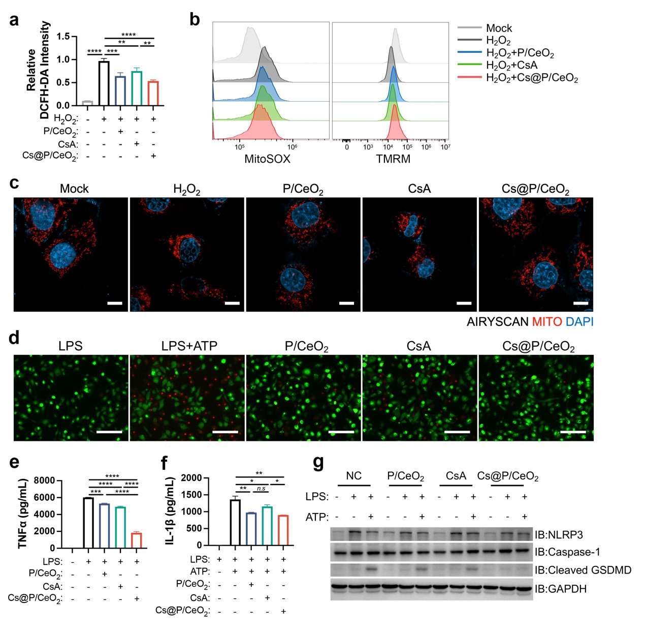 體外研究表明,Cs@P/CeO2能夠降低氧化應激和高滲模型中的角膜上皮細胞的ROS水平,提升線粒體膜電位,恢復線粒體的健康,抑制過度氧化應激導致的角膜上皮細胞死亡。同時,本研究發(fā)現Cs@P/CeO2能夠在炎癥誘導模型中抑制巨噬細胞的炎癥性死亡,抑制炎癥小體的激活和細胞因子TNFα、IL-6、IL-1β的分泌,并促進巨噬細胞的M2極化。這些數據表明,具有雙重功能的Cs@P/CeO2不僅抑制細胞ROS的產生,從而維持線粒體健康,而且下調炎癥過程并重新極化巨噬細胞。